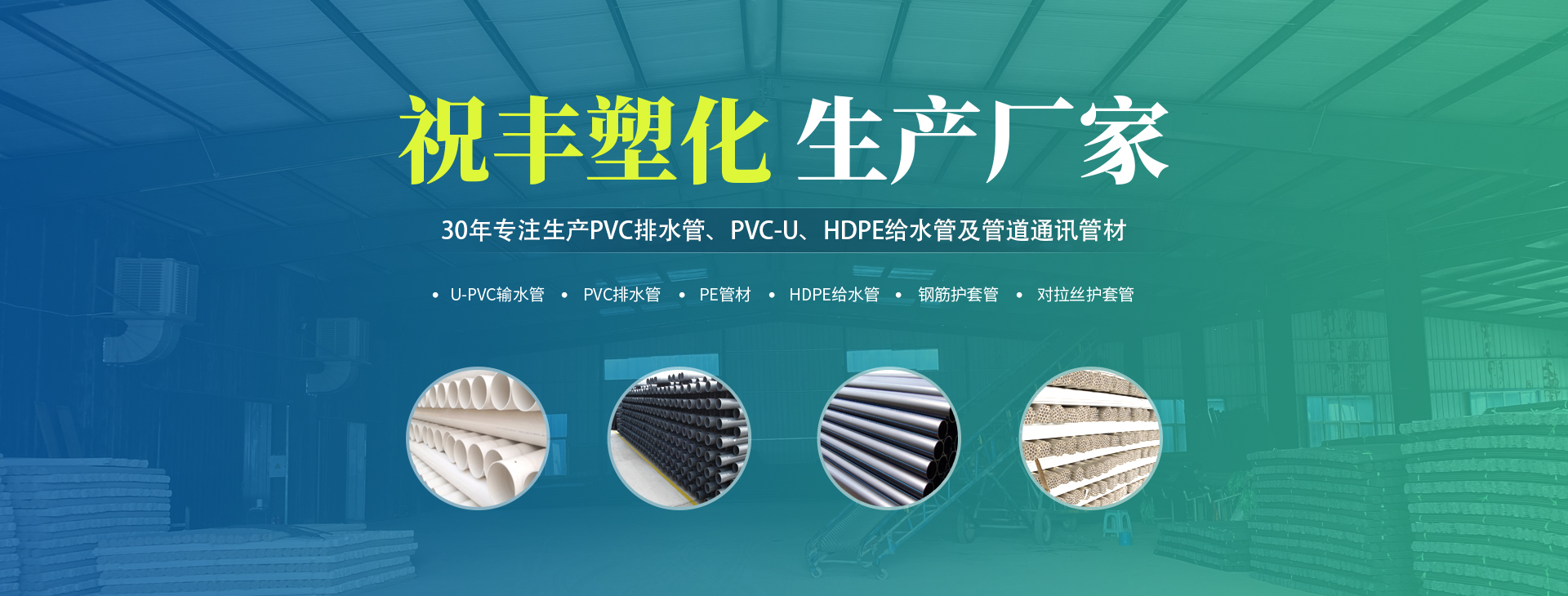 安阳市祝丰塑化有限公司坐落在滑县工业园区,东临大广高速,西临京珠高速,是郑州、鹤壁、安阳、濮阳四个城市的输纽,交通便利、环境优美。       公司始建于八十年代,经过二十余年的艰辛创业,规模不断壮大,由十多万元资产的小厂,发展到现占地面积达一万多平,建筑面积一万平,资产2000多万元管材生产企业。公司生产PVC-U、PVC排水管、HDPE给水管、钢筋护套管管道通讯管材等产品,广泛用于农田节水、高山引水、人畜用水、建筑、电力通讯等多种用途,品种齐全。为了满足用户需求,可承揽各种给水、节水、灌溉工程。“祝丰塑化”凭借强劲的实力,优良的管理水平。“以质量求生存,以信誉求发展”的原则全力以赴和大家共同塑造美好未来。..